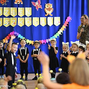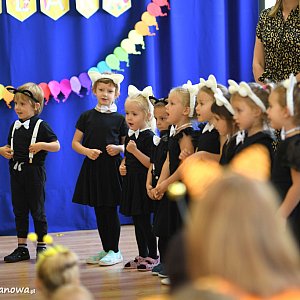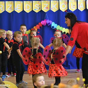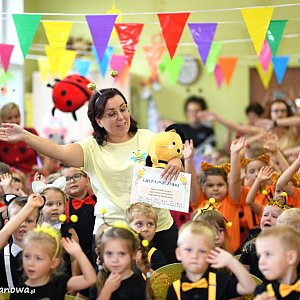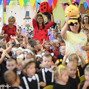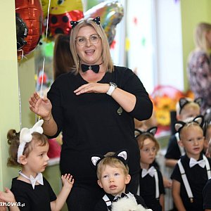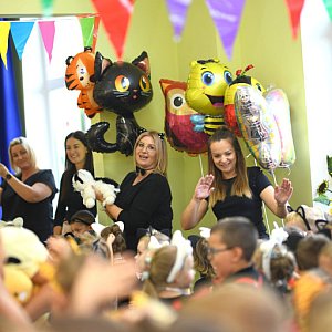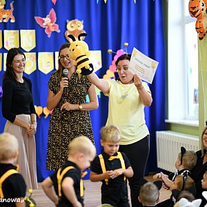 Dodatkowo dzieci otrzymały od Pani Dyrektor dyplomy powitalne oraz słodkiego lizaka. Wychowawczynie przygotowały dla swoich przedszkolaków balony z helem w kształcie grupowych zwierzątek. Wszystkie grupy, nauczycielki, zaproszeni pracownicy przedszkola i rodzice zjednoczyli się śpiewając wesołą a zarazem chwytającą za serce piosenkę pt.: ,,Bo nasze przedszkole to jedna rodzinka".