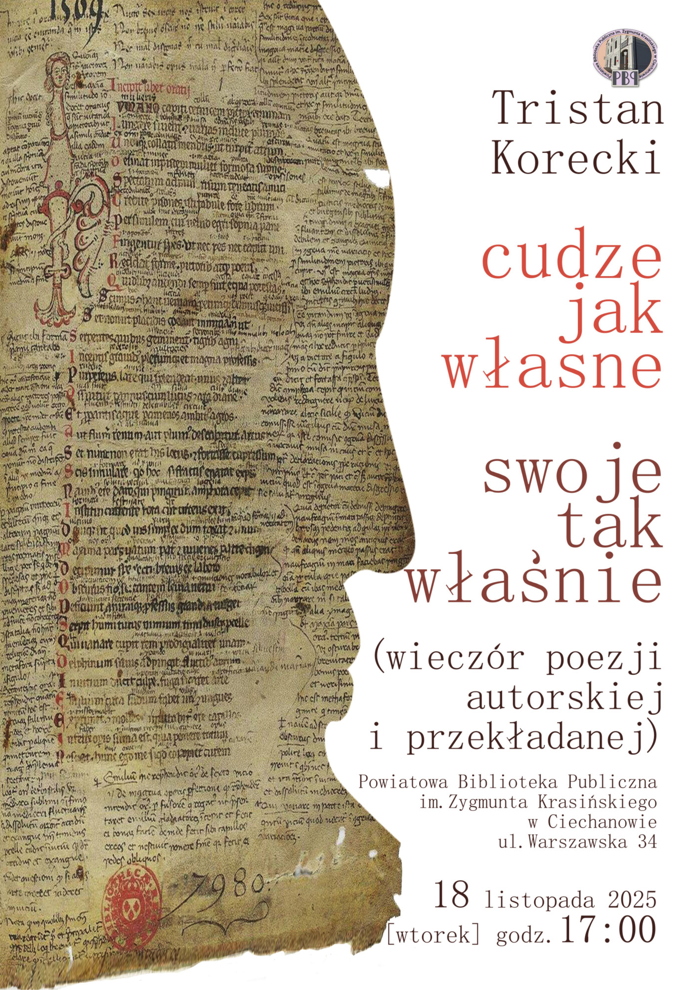 Powiatowa Biblioteka Publiczna ma zaszczyt zaprosić wszystkich miłośników poezji (i nie tylko) na spotkanie z Panem Tristanem Koreckim, poetą, tłumaczem poezji, które odbędzie się 18 listopada o godz. 17.00 w siedzibie PBP na ul. Warszawskiej 34. Spotkacie się z niezwykle ciekawą postacią, poznacie tajniki jakże skomplikowanej sztuki tłumaczenia poezji, posłuchacie wyjątkowych utworów…