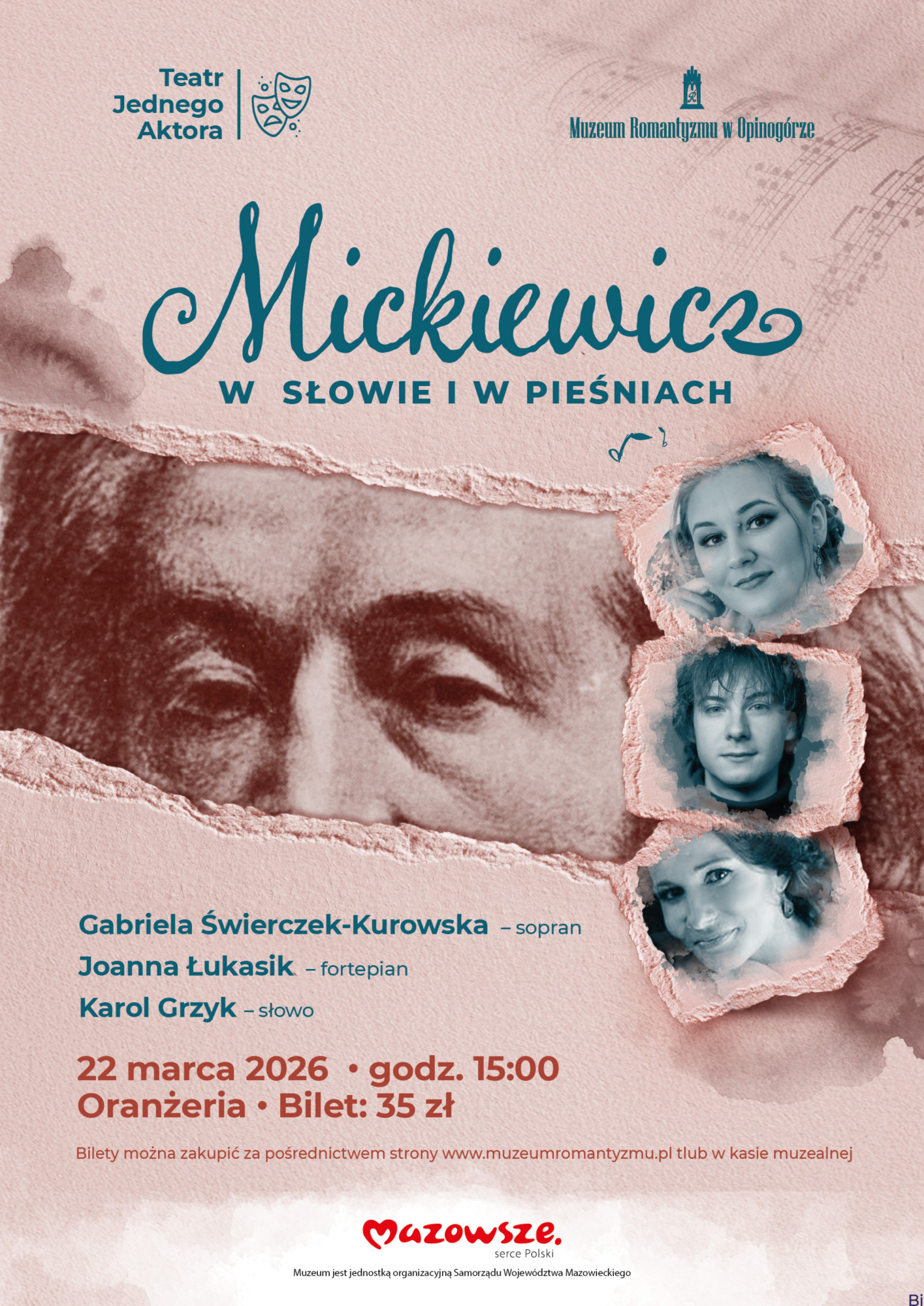 W niedzielę 22 marca 2026 r. o godzinie 15.00 w Muzeum Romantyzmu w Opinogórze, w ramach Teatru Jednego Aktora odbędzie się autorski montaż słowno-muzyczny pt. „Mickiewicz w słowie i w pieśniach”. W programie znalazły się pieśni m.in. Stanisława Moniuszki, Fryderyka Chopina, Stanisława Niewiadomskiego oraz recytacje wybranych fragmentów dzieł Adama Mickiewicza. Całość tworzy spójną narrację – osobisty portret Mickiewicza i współczesne spojrzenie na jego słowa.
