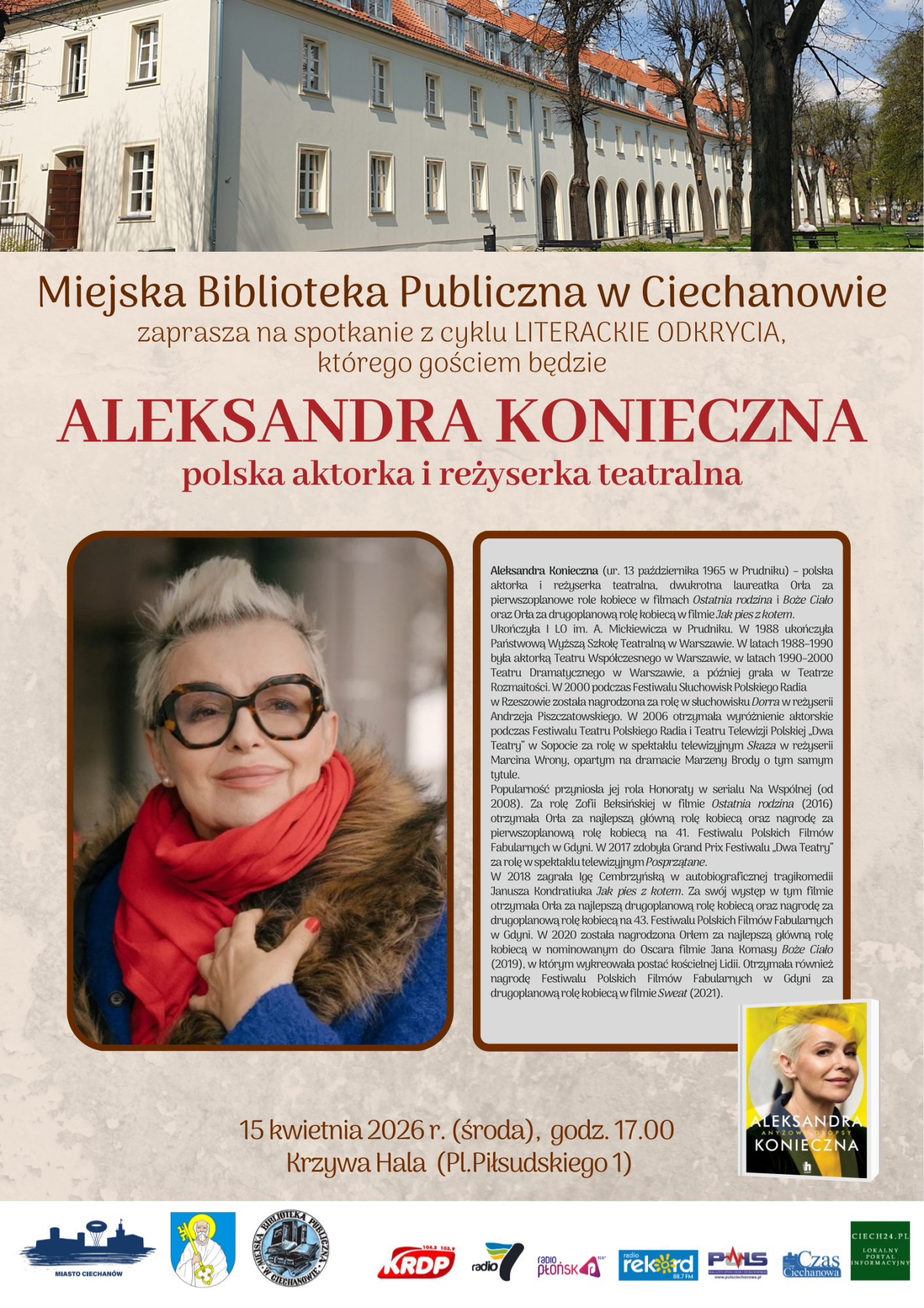 W Miejskiej Bibliotece Publicznej odbędzie się spotkanie autorskie z Aleksandrą Konieczną, polską aktorką i reżyserką teatralną, dwukrotną laureatką Orła za pierwszoplanowe role kobiece w filmach Ostatnia rodzina i Boże Ciało oraz Orła za drugoplanową rolę kobiecą w filmie Jak pies z kotem.