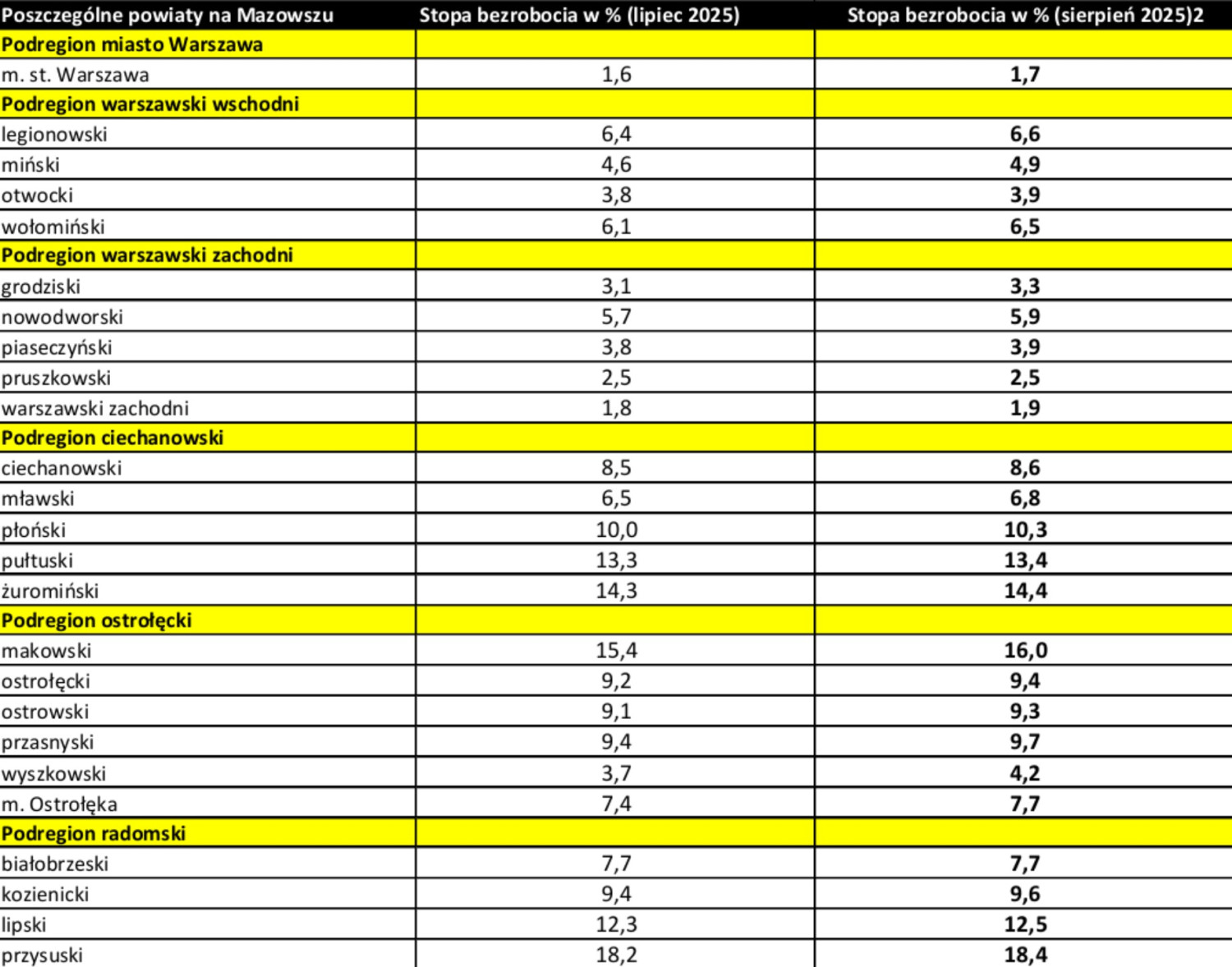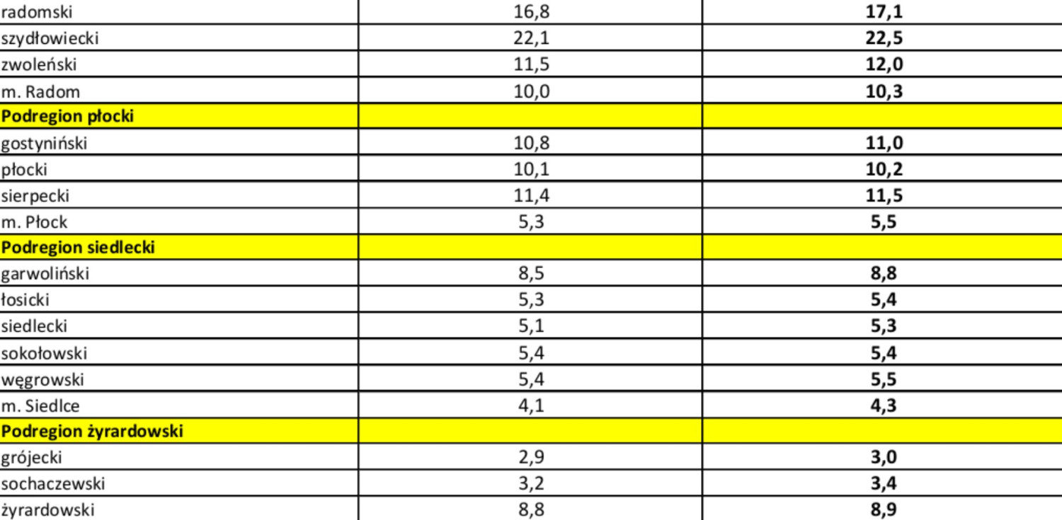 Mimo danych, które wskazują na wzrost bezrobocia, Mazowsze nadal jest regionem, w którym jest ono jednym z najniższych w kraju. Lepszym wynikiem, tak jak w poprzednich miesiącach, pochwalić się mogą tylko województwa: wielkopolskie (3,4%) i śląskie (4,2%).