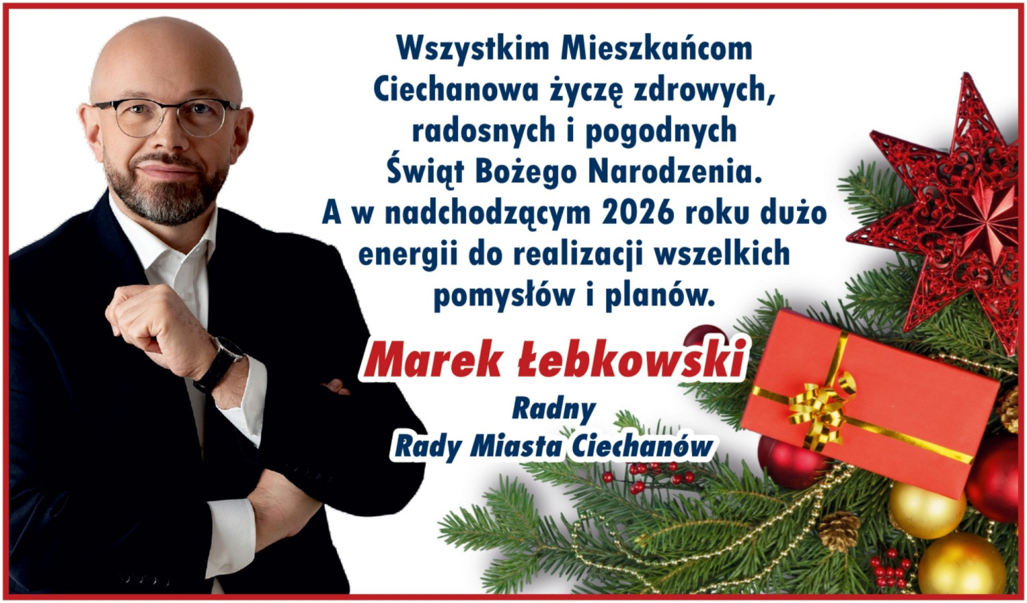 Życzenia świąteczno-noworoczne, za naszym pośrednictwem, przekazuje Marek Łebkowski – Radny Rady Miasta Ciechanów.