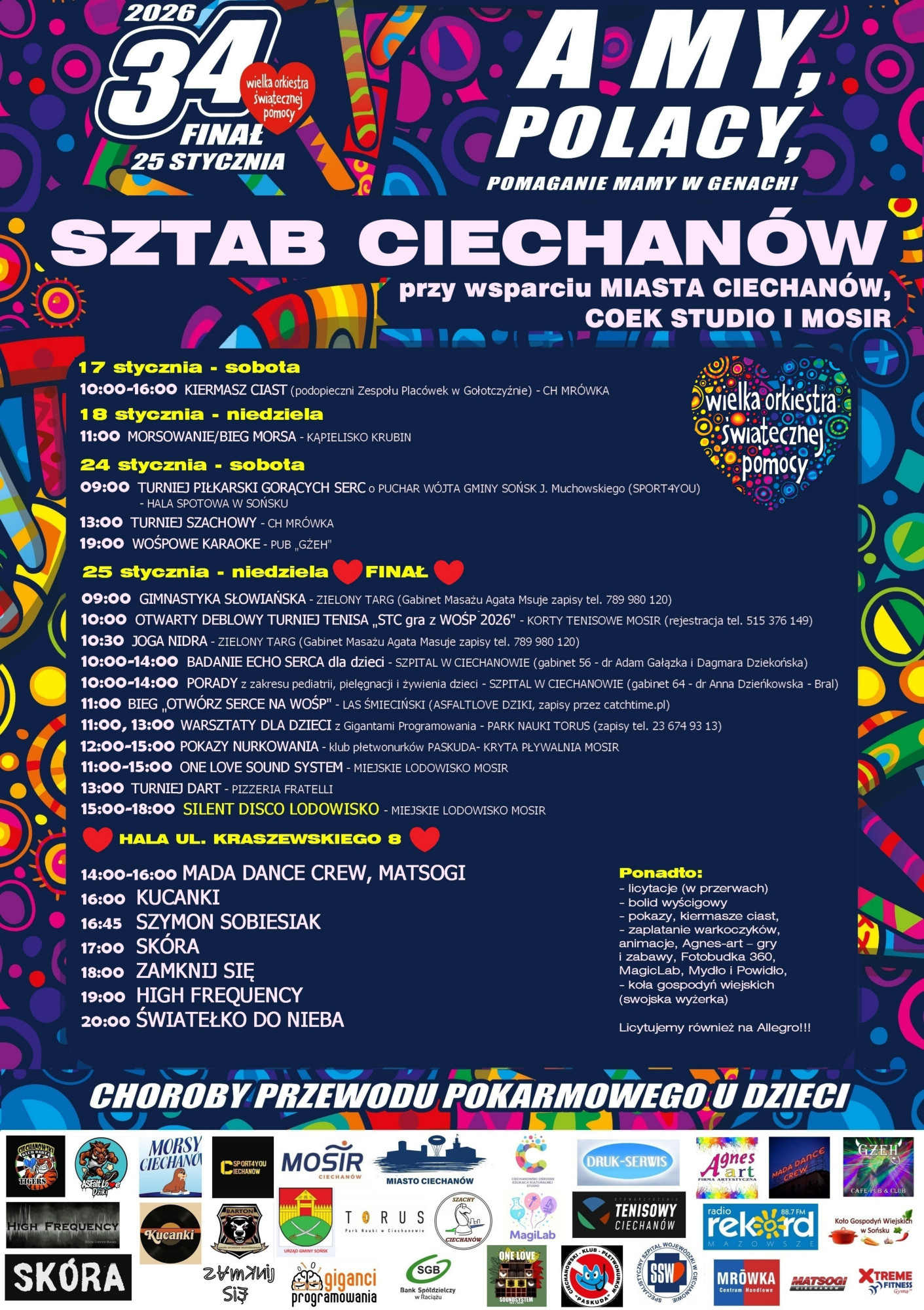 Centralnym punktem niedzielnych wydarzeń będzie hala przy ul. Kraszewskiego 8, gdzie od godziny 14:00 rozpoczną się koncerty finałowe. Na scenie zaprezentują się lokalne grupy taneczne, sportowe i muzyczne, wśród nich Mada Dance Crew, Matsogi Ciechanów, Kucanki, Szymon Sobiesiak, Skóra, Zamknij Się oraz High Frequency. Tradycyjnie, w przerwach między występami odbywać się będą licytacje na rzecz WOŚP.