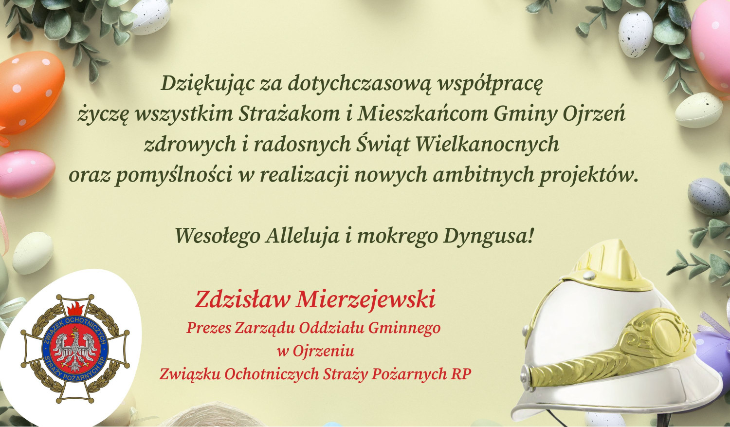 Wielkanocne życzenia przekazuje za naszym pośrednictwem Zdzisław Mierzejewski - Prezes Zarządu Oddziału Gminnego w Ojrzeniu Związku Ochotniczych Straży Pożarnych RP.