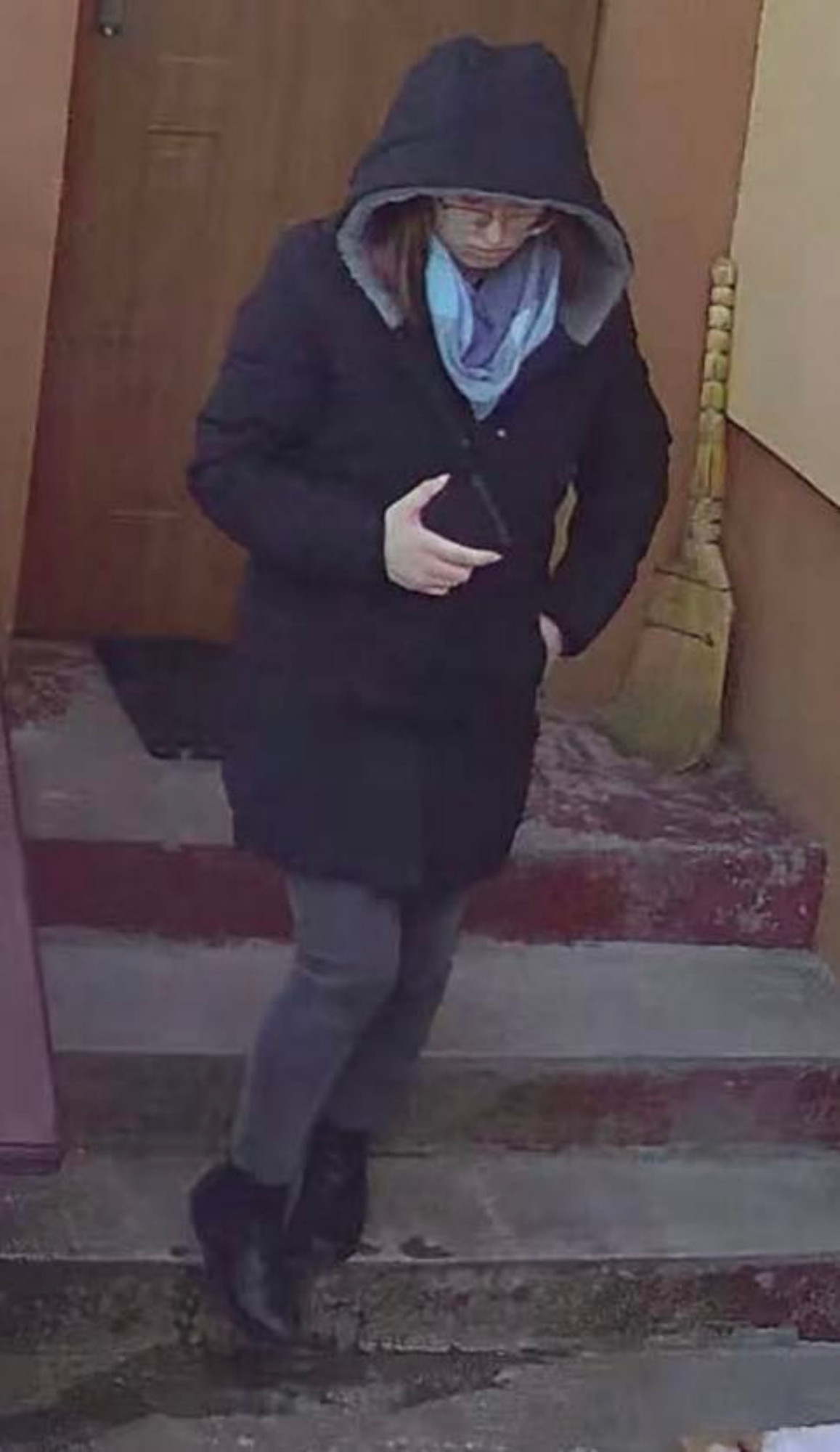 W chwili wyjścia z domu była ubrana jak na załączonym zdjęciu (poniżej). Czarna kurtka do kolan z kapturem, jasny szalik, szare spodnie czarne buty.